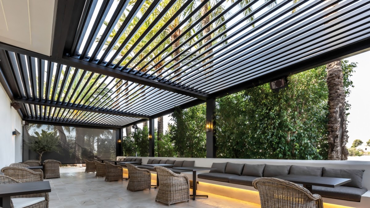The key feature in the Pergolas unique design is the roof louvers, the manual winding mechanisms allow you to control the direction of the roof louvers creating an open or closed space. The genius built-in drainage system means that if the weather changes, just close the louvered roof to make the area completely weatherproof, any rainwater that lands on the louvers will flow into the guttering channels and drain through the legs to the ground.